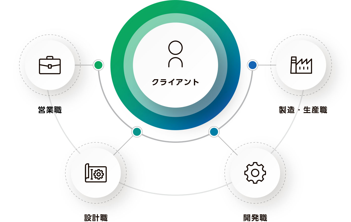 新規クライアントの開拓と既存クライアントとの関係強化を担当します。オーダーメイドの製品提供が多いため、クライアントの特定のニーズを詳細に把握し、技術チームと連携して最適なソリューションを提案します。クライアントの納期・コストなどの要望も各部署へ共有します。
